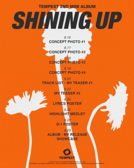 템페스트는 8월 11일 공식 SNS를 통해 두 번째 미니 앨범 ‘SHINING UP'(샤이닝 업) 타임테이블을 선보였다.
